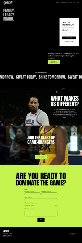 We manage their website, lead creative direction, develop social content, and support ongoing brand growth through merch and strategic execution. From how Gage shows up digitally to how athletes are positioned, every touchpoint is intentional. The result is a unified ecosystem that speaks to family, legacy, and brand while actively driving opportunities for the agency and its roster.