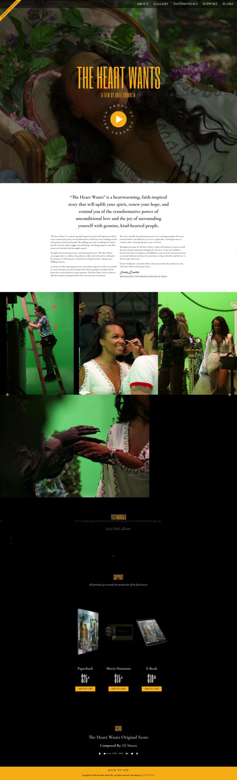 We designed and developed a platform that blends storytelling, visuals, and commerce into one cohesive journey. From showcasing behind the scenes moments to highlighting testimonials and enabling direct support through purchases and donations, every section was built to deepen connection. The result is a site that extends the life of the film beyond the screen and gives audiences a way to engage, support, and immerse themselves in the story.